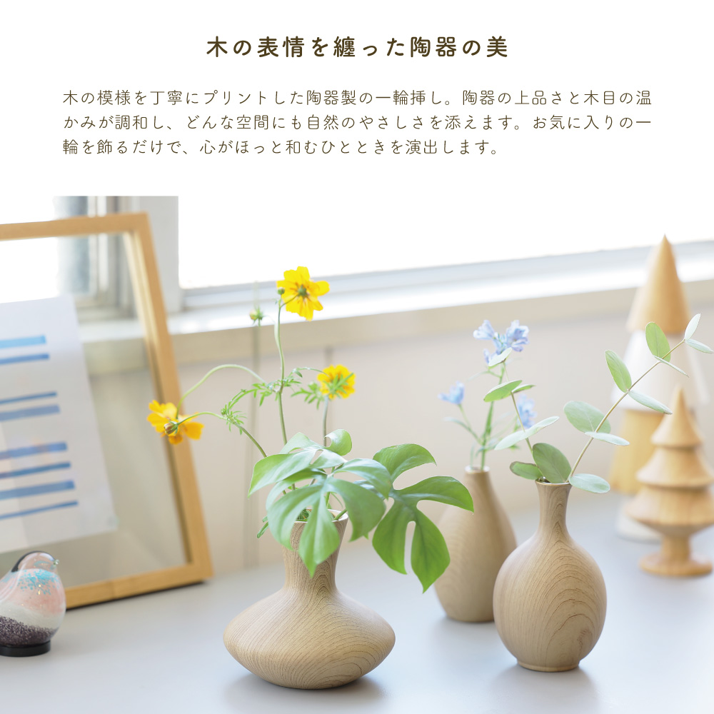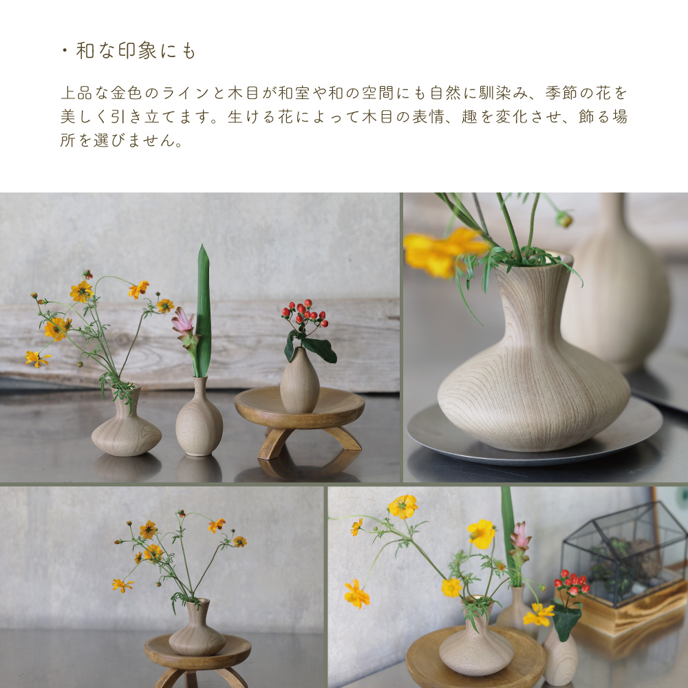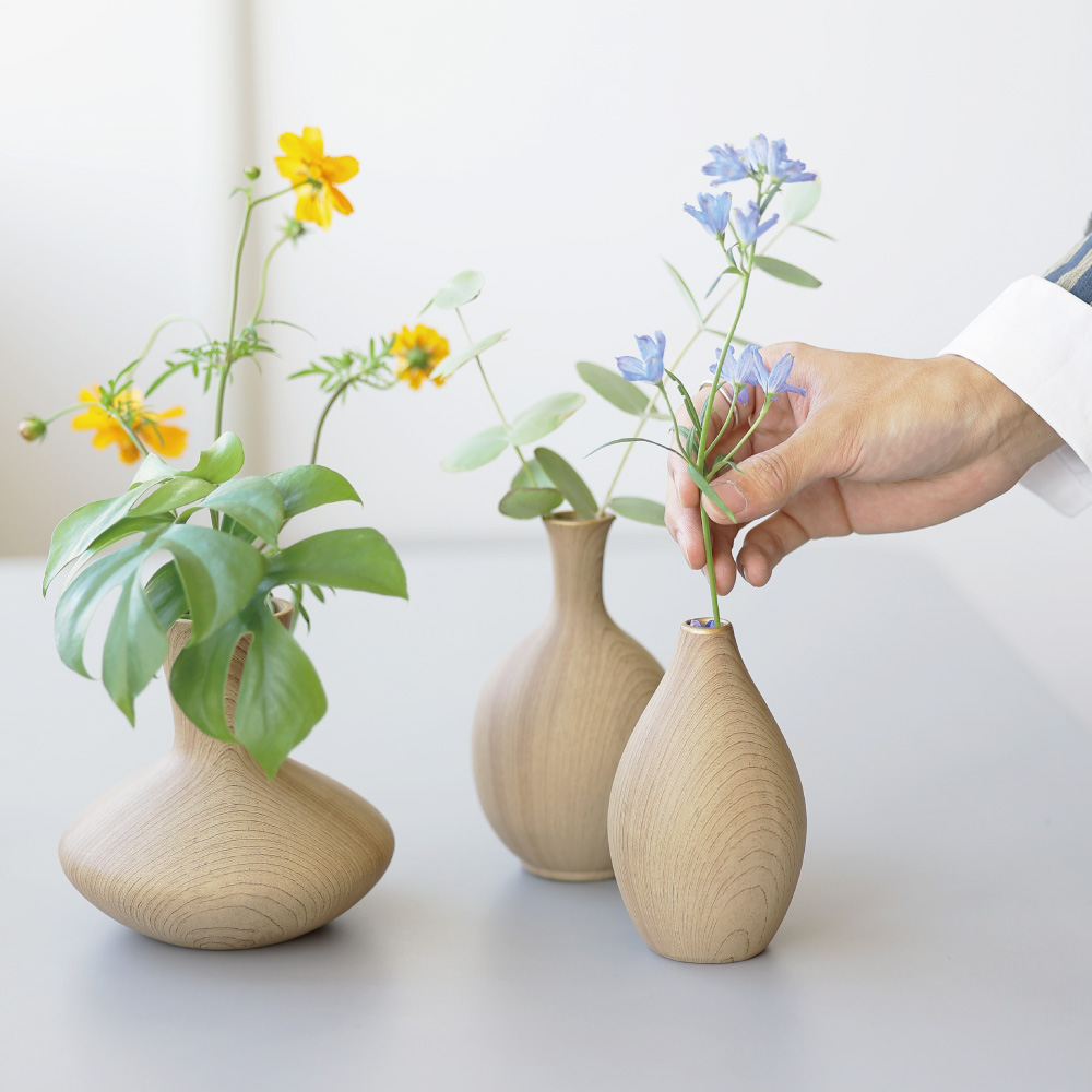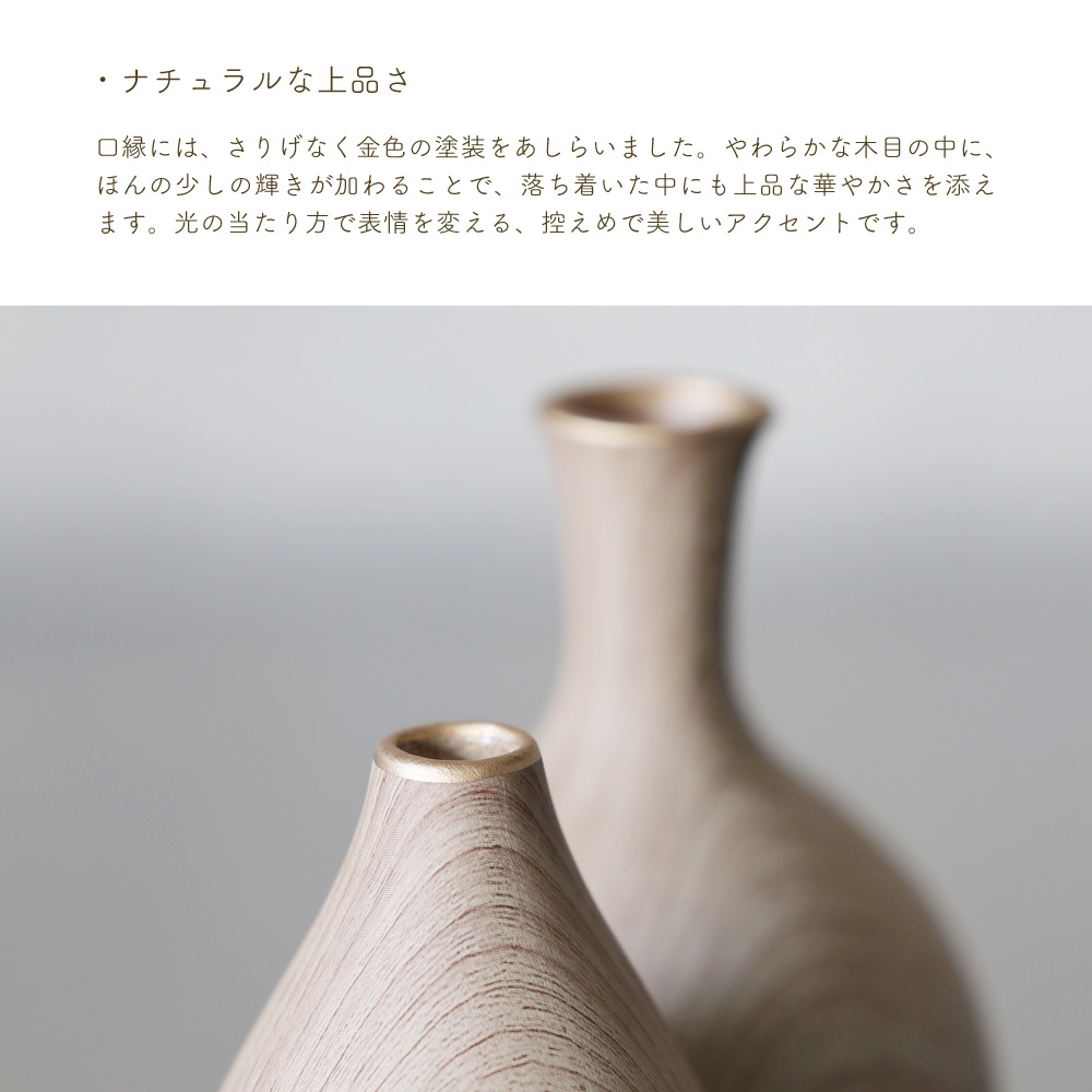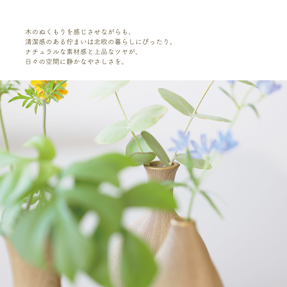 木の温もりを感じさせるような質感と、やさしいフォルムが特徴のこのベースは、まるで森の中から切り出されたような趣を持っています。シンプルでありながらも存在感があり、花を生けなくてもオブジェとして空間を彩る力を持っています。