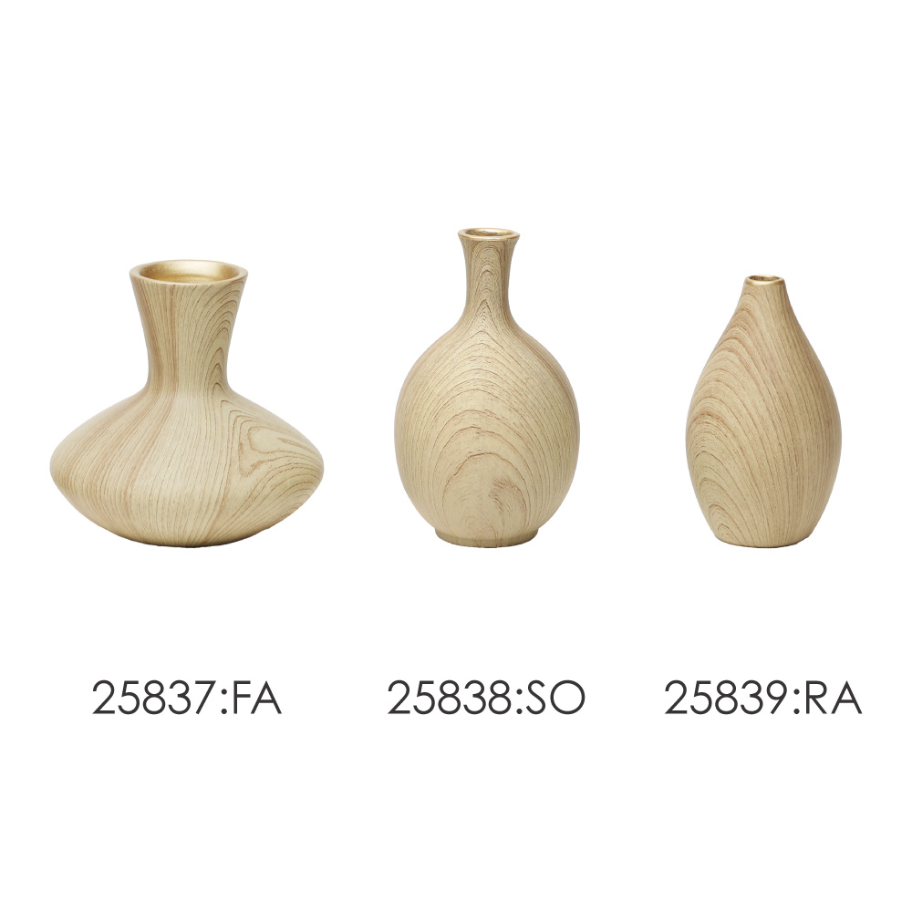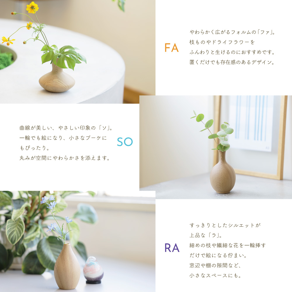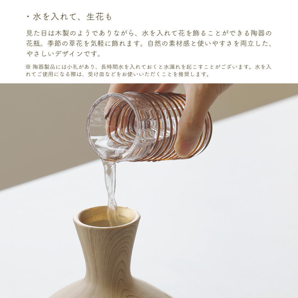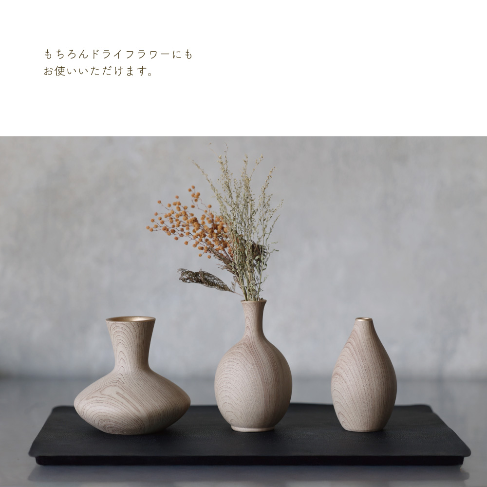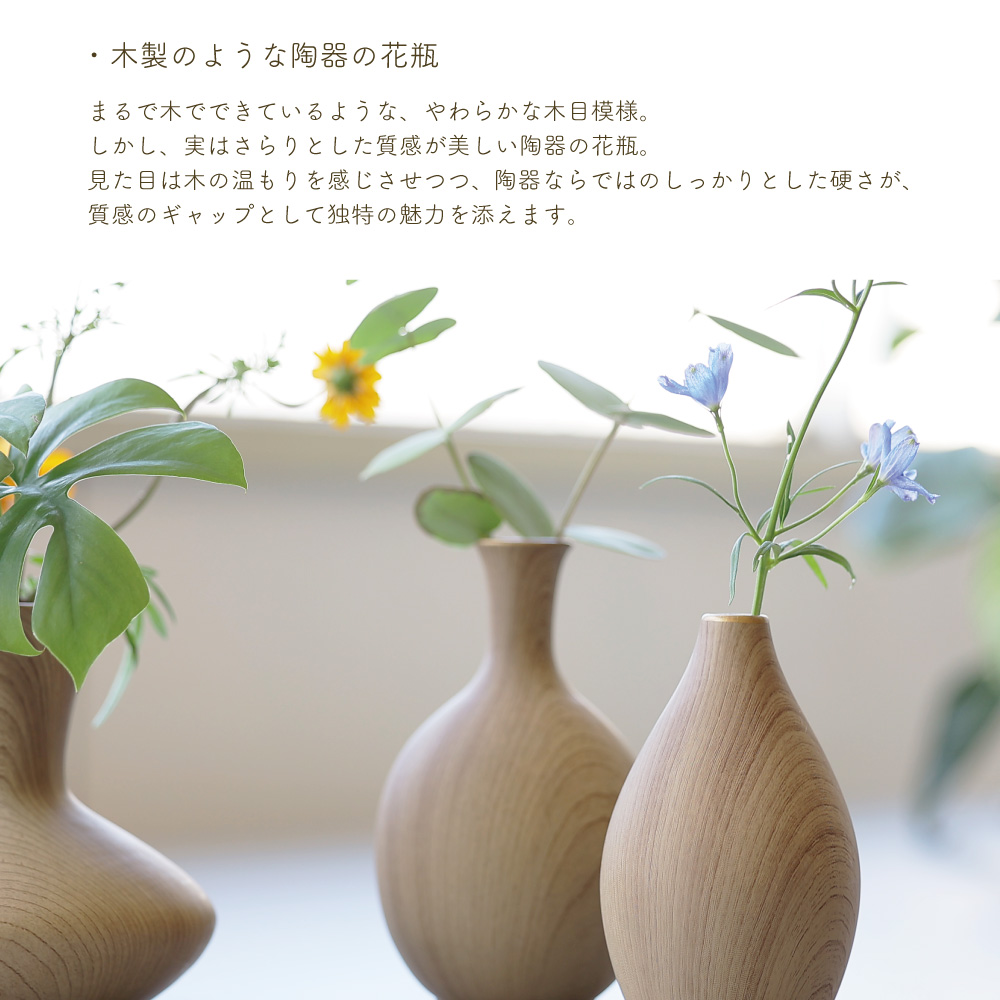 木の温もりを感じさせるような質感と、やさしいフォルムが特徴のこのベースは、まるで森の中から切り出されたような趣を持っています。シンプルでありながらも存在感があり、花を生けなくてもオブジェとして空間を彩る力を持っています。