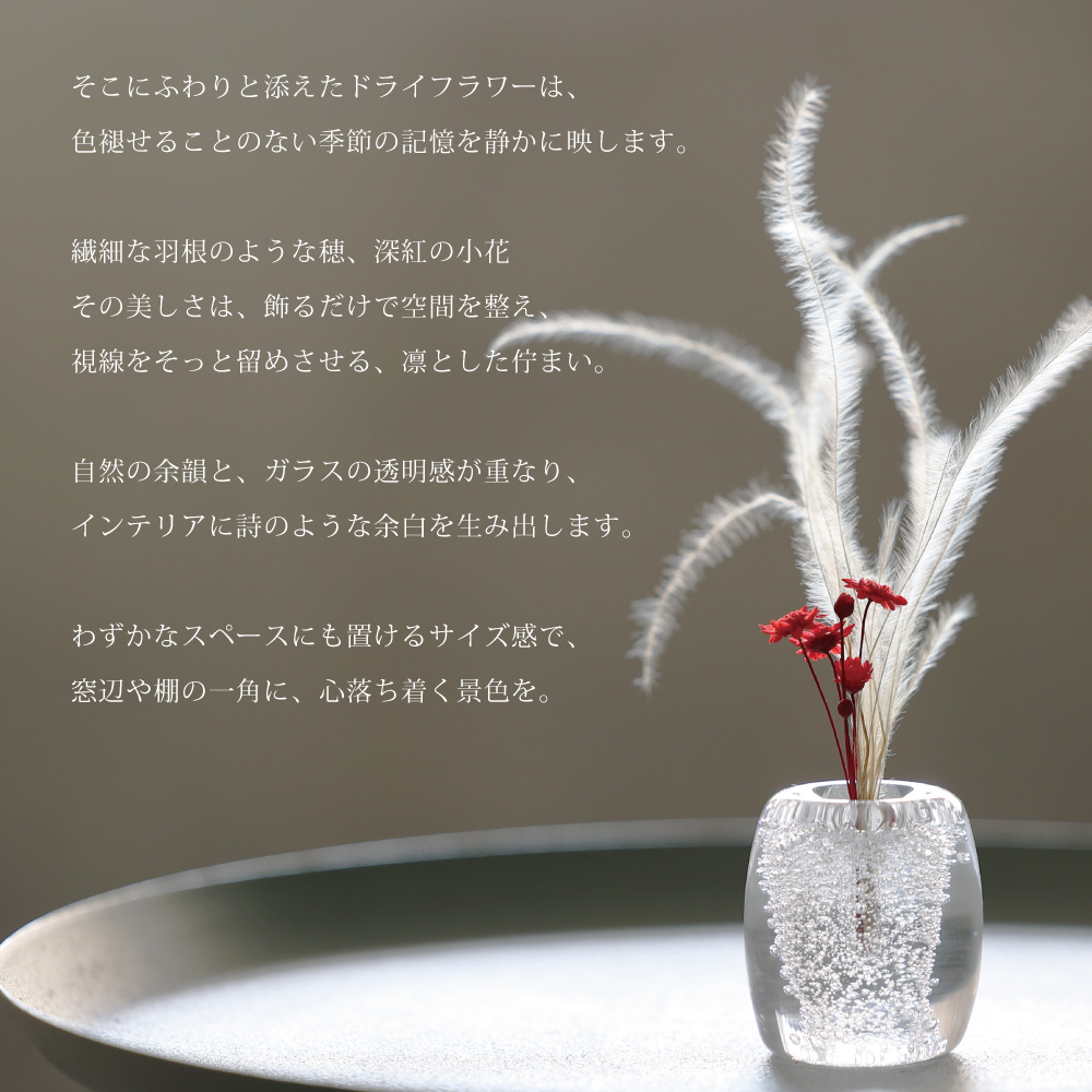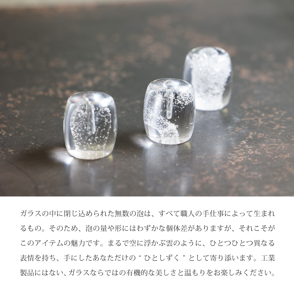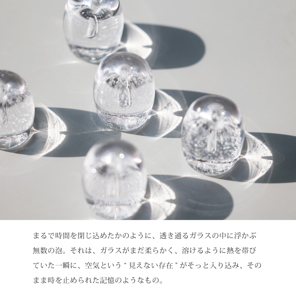 透明感あふれるガラスと、内側に閉じ込められた繊細な気泡が生み出す、