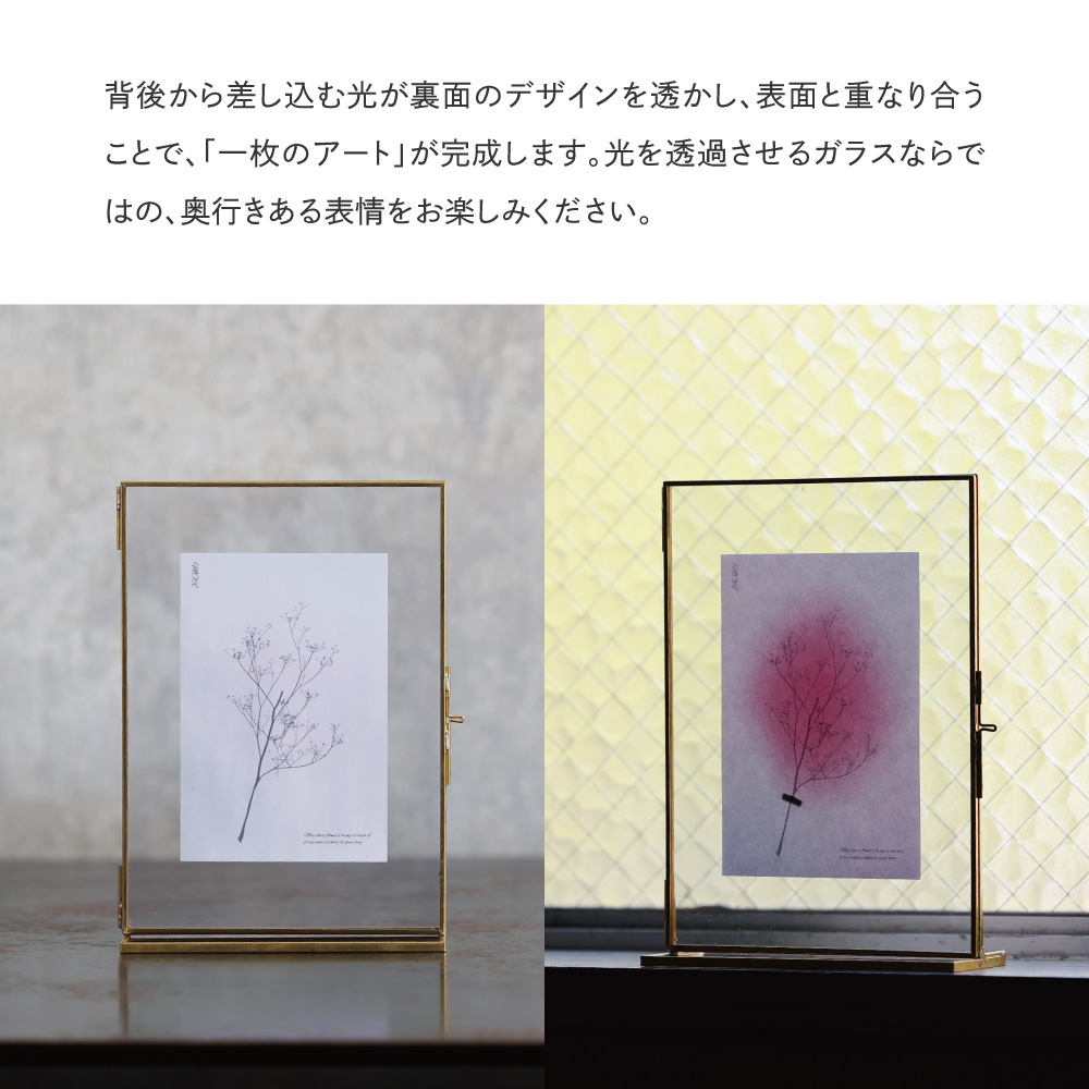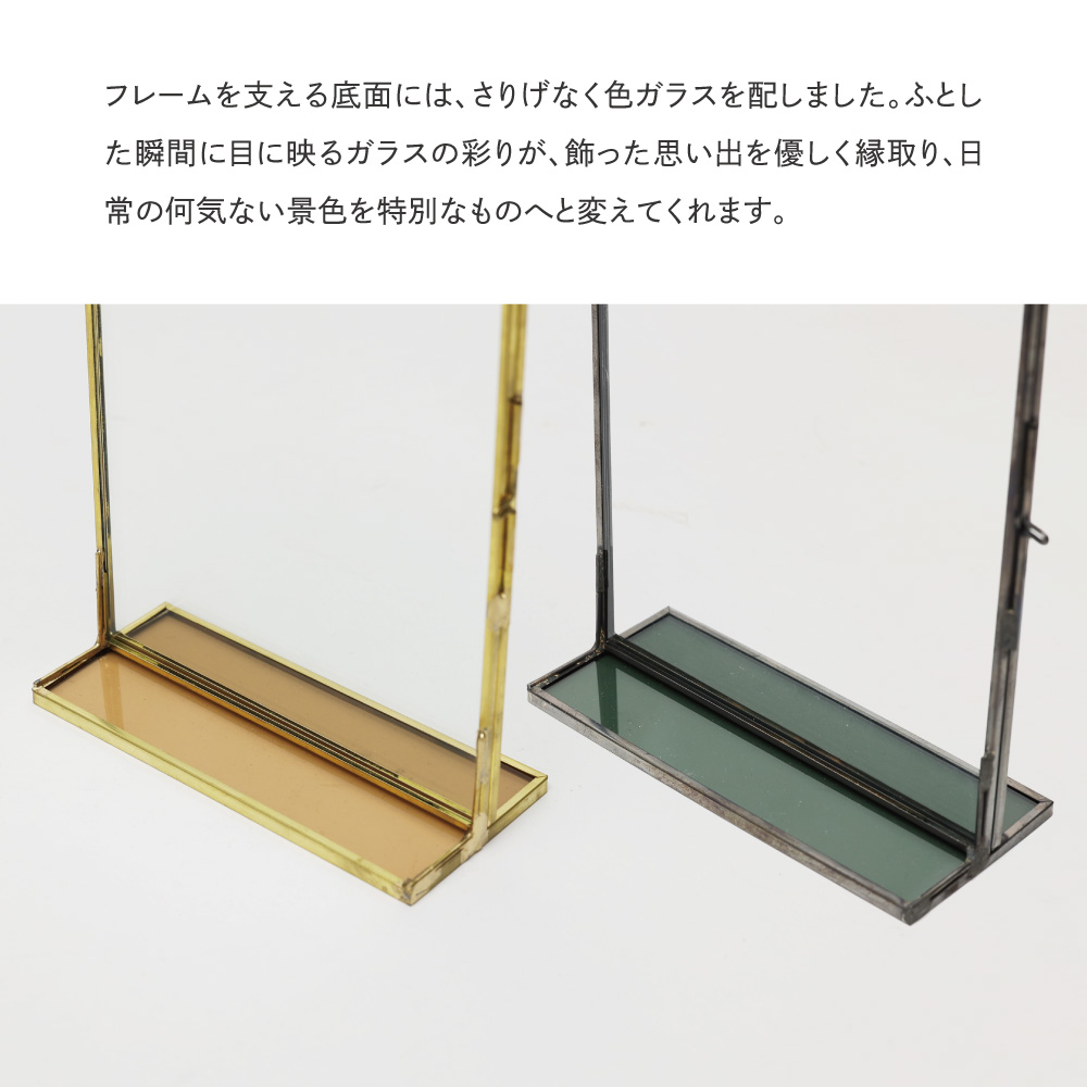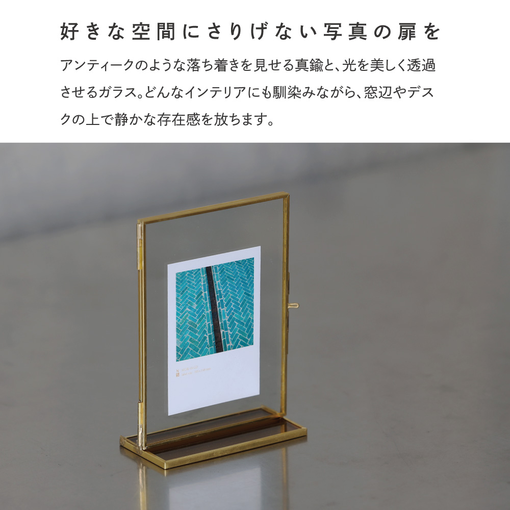 時を重ねるほどに味わいを増す真鍮と、凛とした透明感を放つガラス。二つの素材が織りなす静かな美しさが、飾るものにそっと寄り添います。写真やアートの余白までを引き立てる、クラシカルな佇まいのフレームです