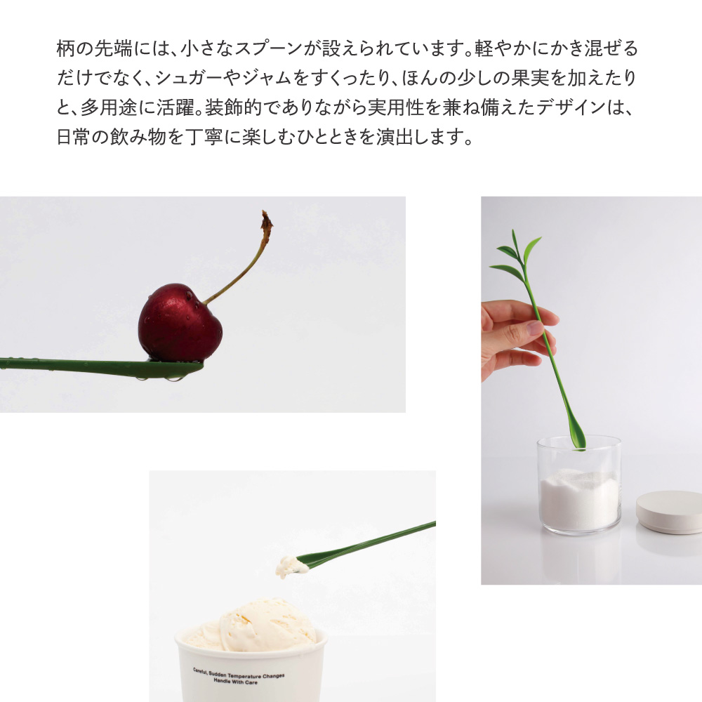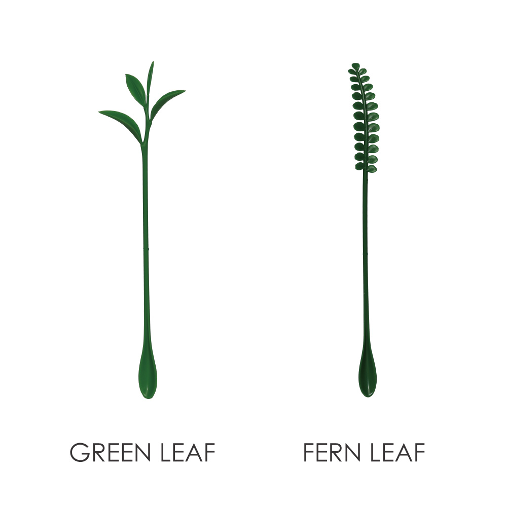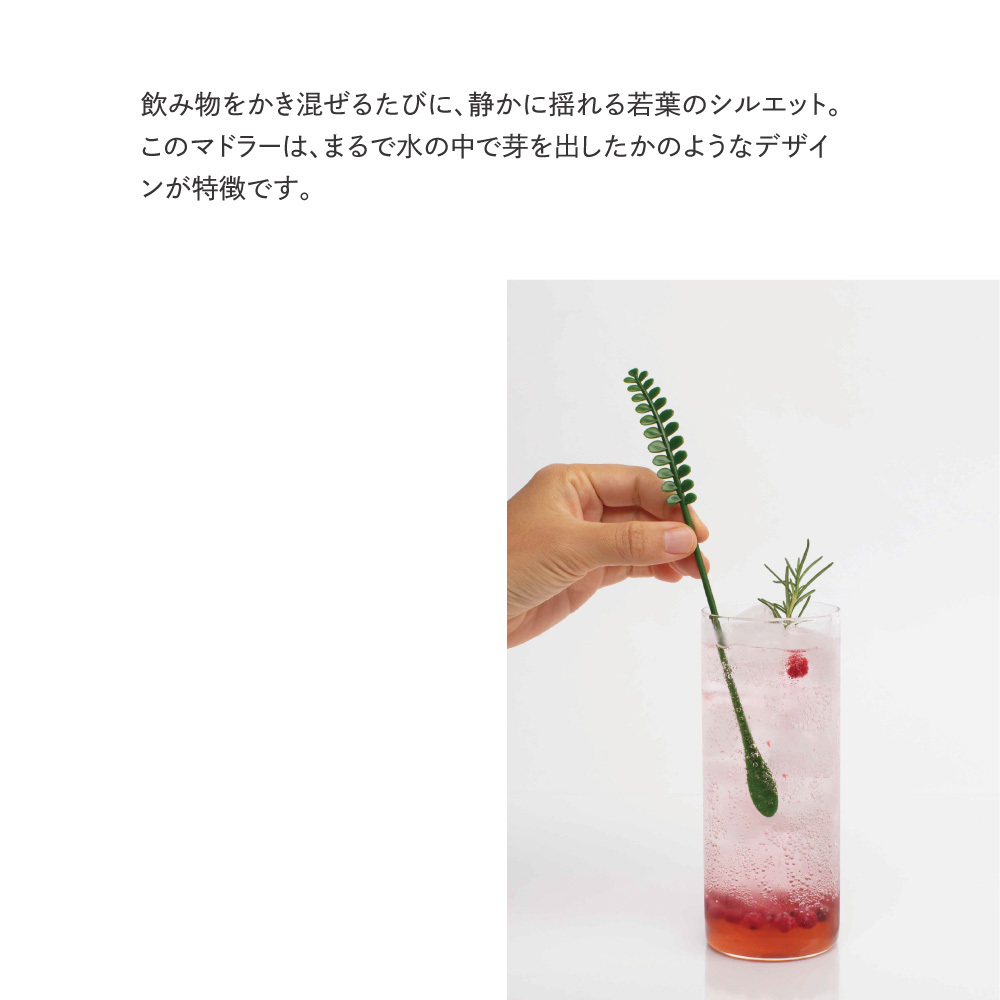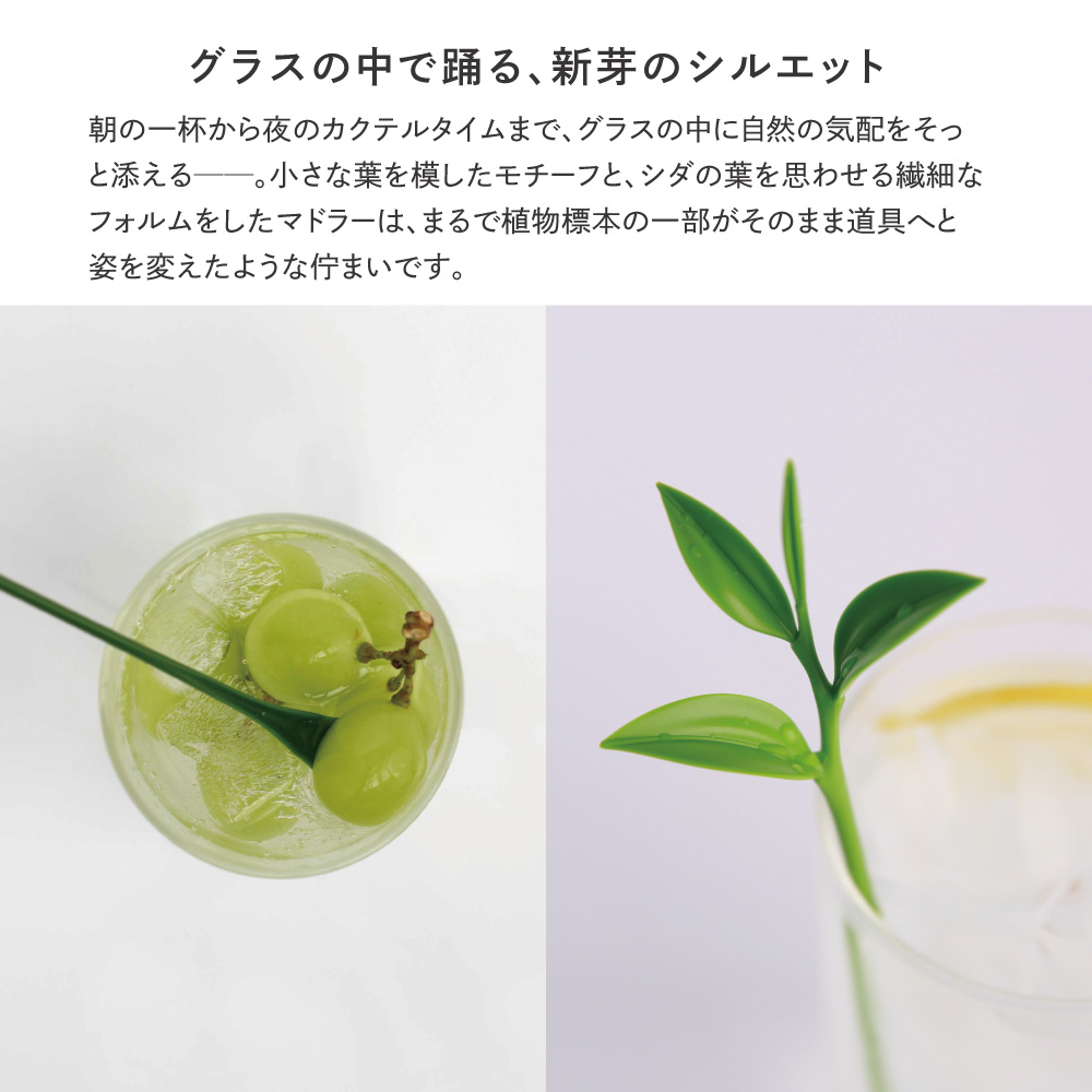 ナチュラルな葉っぱデザインのマドラーは、カクテルやアイスコーヒー、ジュースにもぴったり。グラスの中に添えるだけで、ちょっとした癒しのエッセンスをプラスできます。
