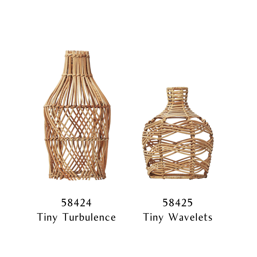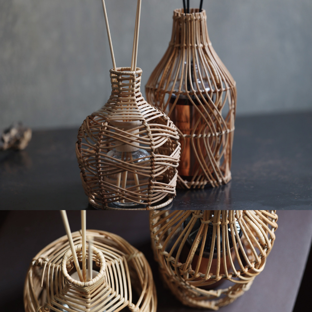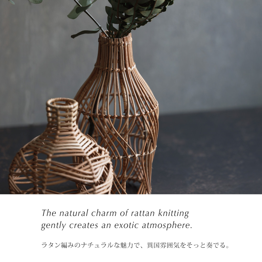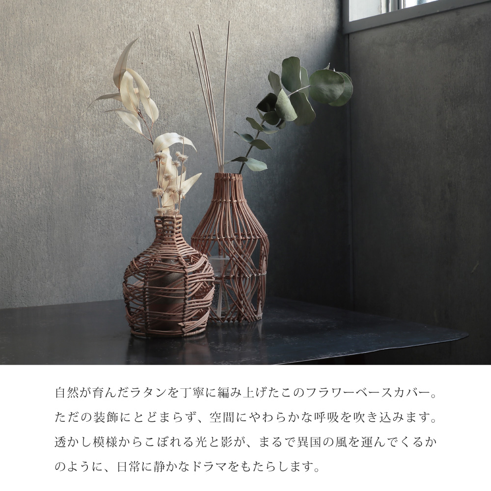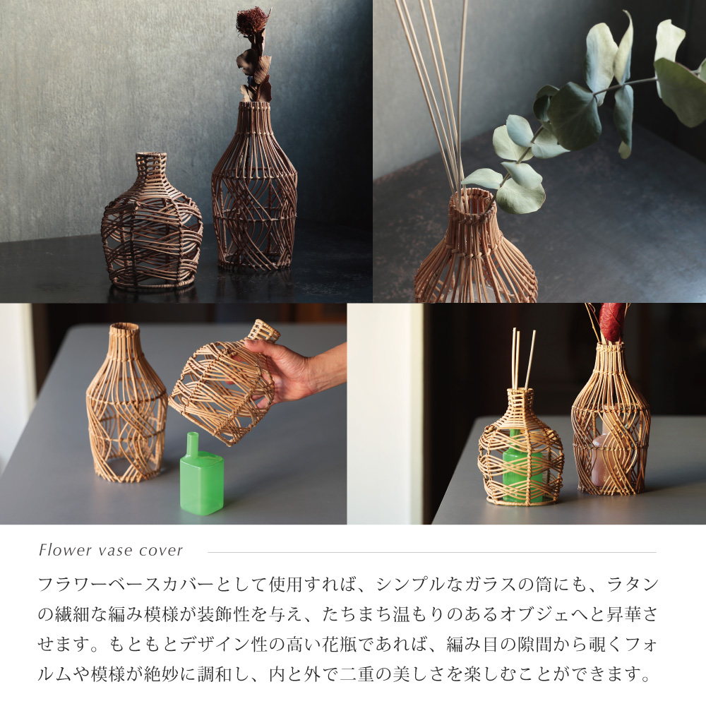 フラワーベースカバーとして使用すれば、シンプルなガラスの筒にも、ラタンの繊細な編み模様が装飾性を与え、たちまち温もりのあるオブジェへと昇華させます。