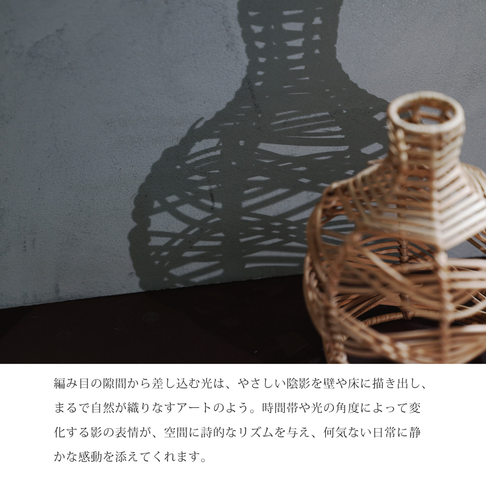 編み目の隙間から差し込む光は、やさしい陰影を壁や床に描き出し、まるで自然が織りなすアートのよう。