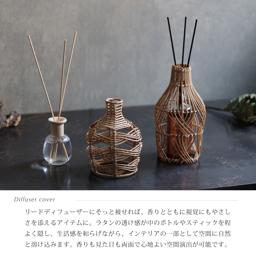 ラタンの透け感が中のボトルやスティックを程よく隠し、生活感を和らげながら、インテリアの一部として空間に自然と溶け込みます。