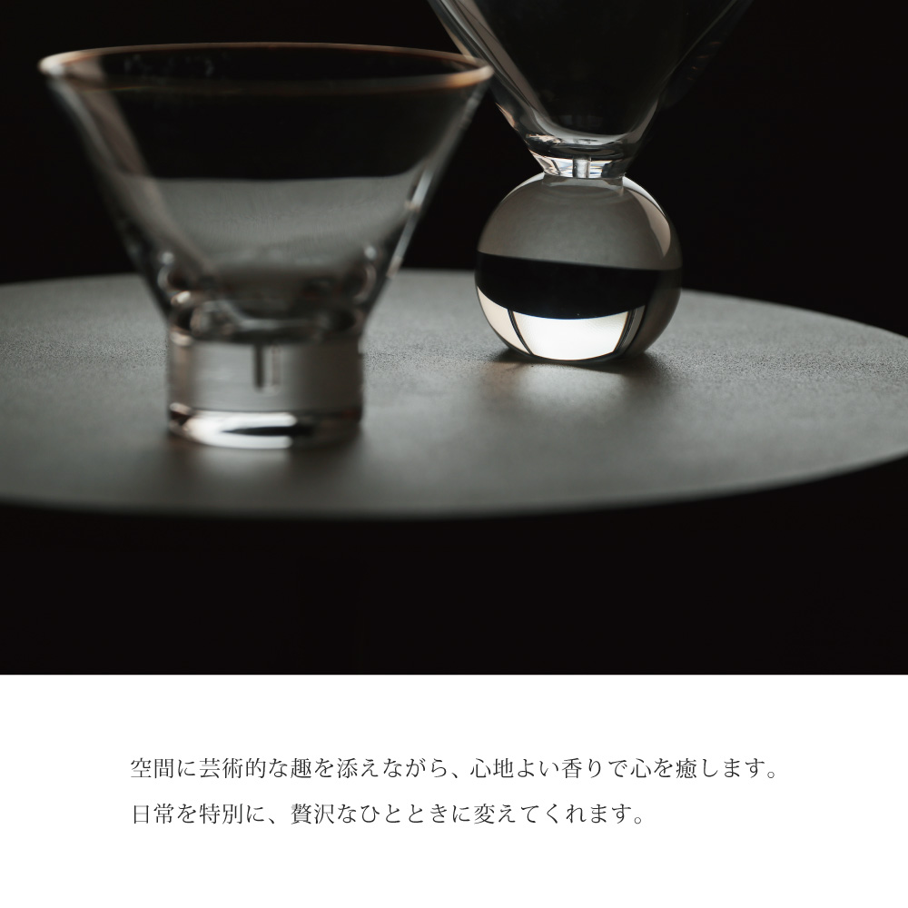 お香を灯すと、ガラスの美しい透明感が炎を映し出し、幻想的な雰囲気を演出します。部屋全体に広がる香りが、心地よいリラックスをもたらします。