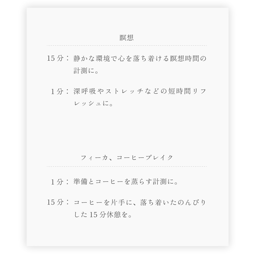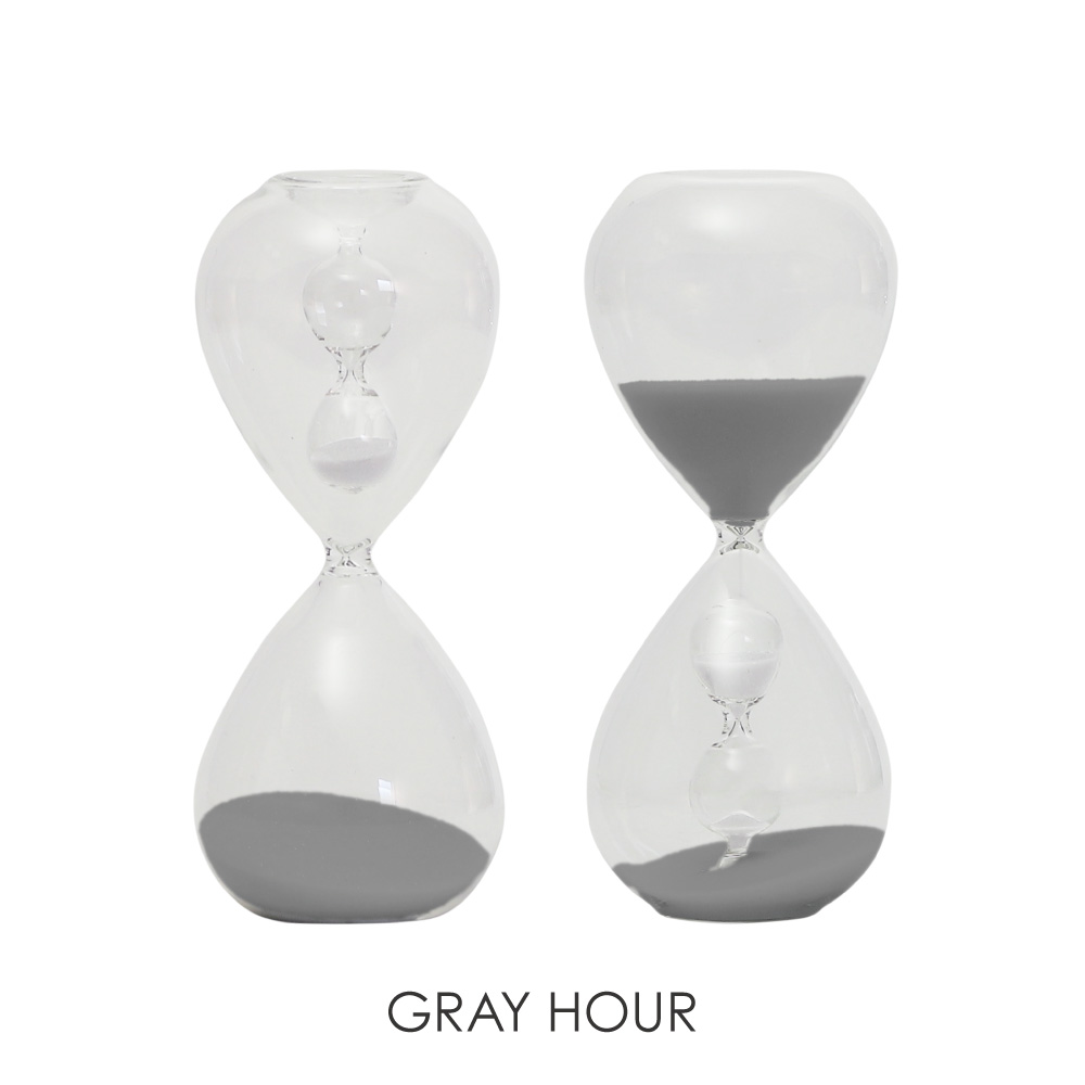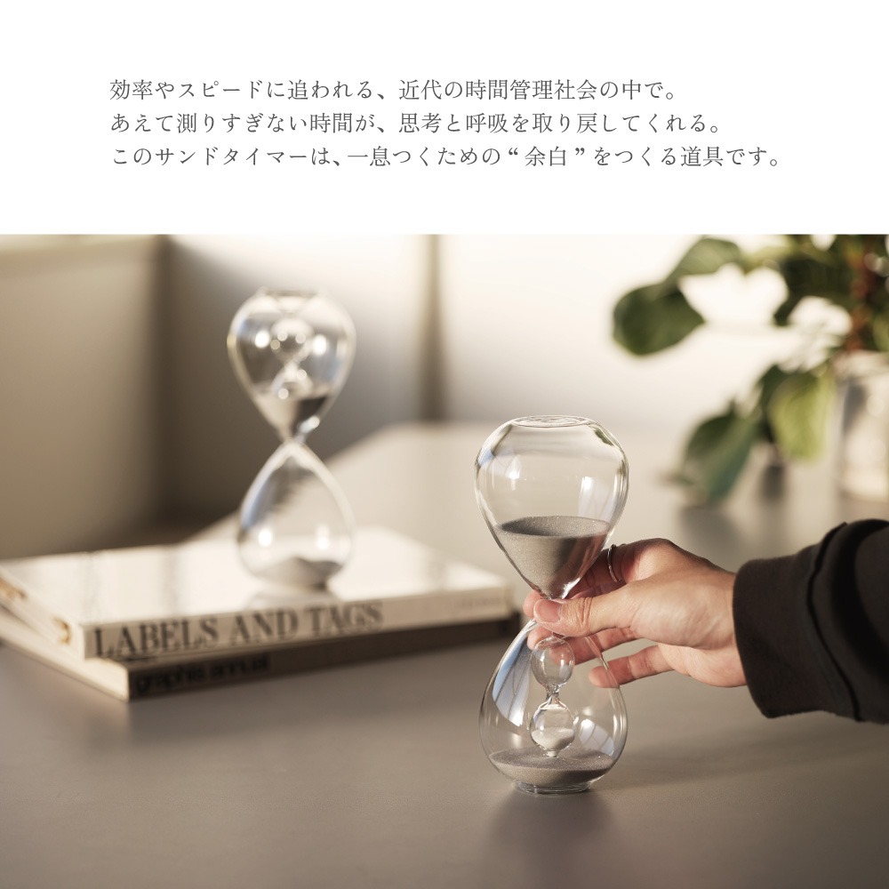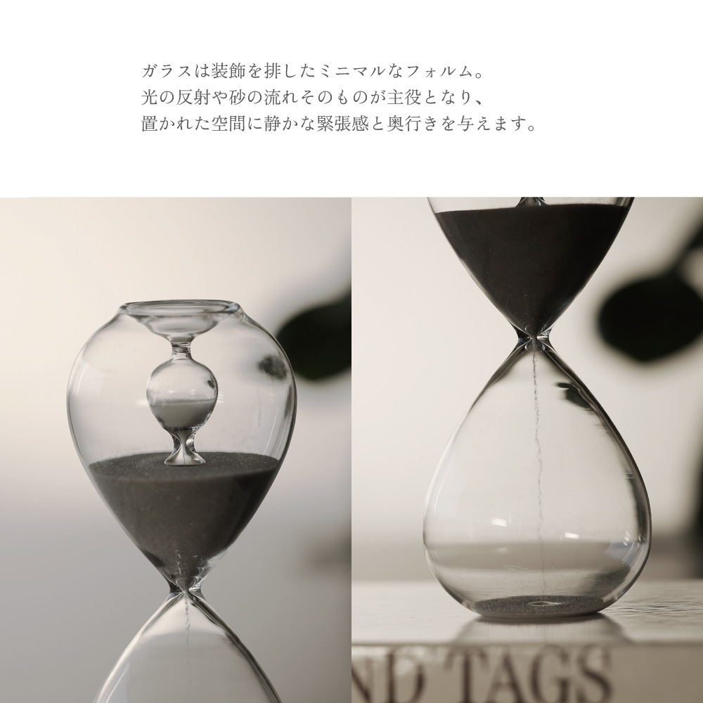 外側の砂が落ちる様子を眺めながら、内側で繊細に動く小さな砂時計を楽しむことができ、インテリアとしての美しさも兼ね備えています。